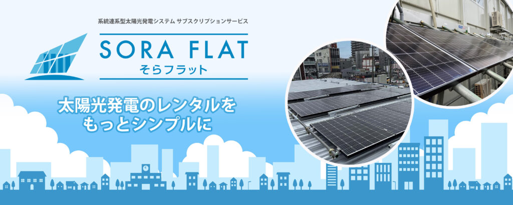 そらフラットは、系統連系型の太陽光発電システムを月額定額料金で導入できるサブスクリプションサービスです。太陽光発電システムに必要なものをパッケージ化し、シンプルで分かりやすい月額定額にすることで太陽光発電システムをお手軽に導入いただけます。